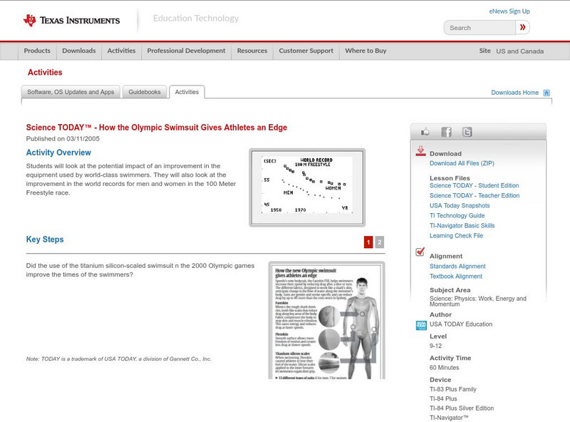 In this activity students will look at the potential impact of an improvement in the equipment used by world-class swimmers. They will also look at the improvement in the world records for men and women in the 100 Meter Freestyle race.