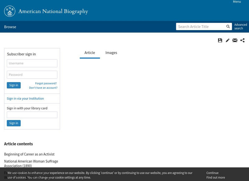 This site provides a detailed biography of Carrie Chapman Catt, suffragist leader and peace activist during the early 1900s.