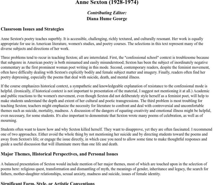 Offers classroom issues and strategies for teaching Anne Sexton's writings.