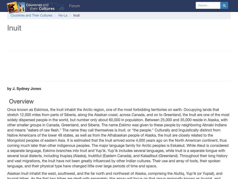 Provides an overview of the traditional culture and lifestyle of the Inuit. (Note: Content is not the most current.)