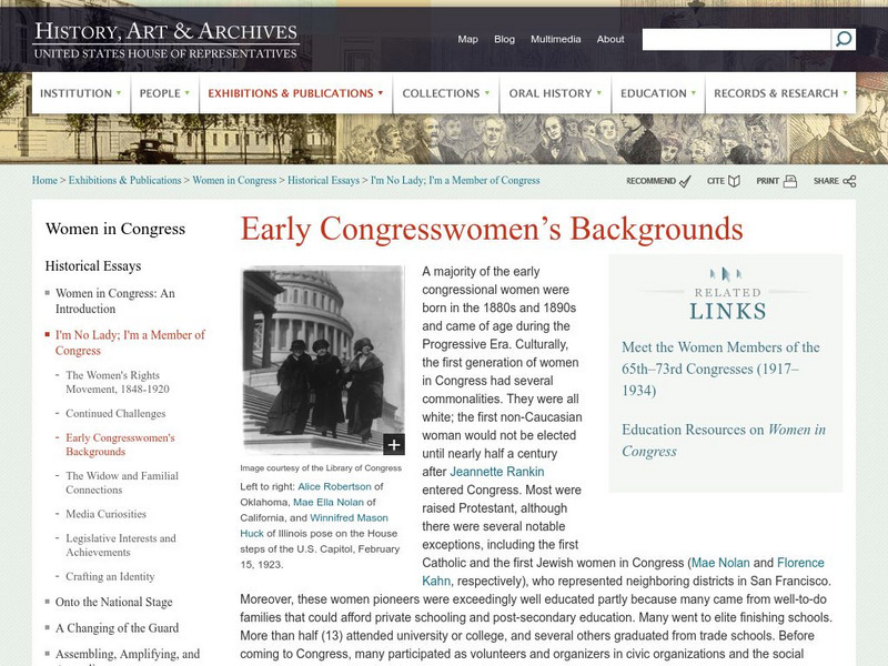 The first women in Congress paved the way for women's suffrage. Examine the backgrounds of these women to see what characteristics helped propel them to Congress.
