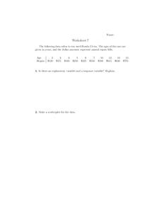 In this statistics worksheet, 9th graders solve and complete 5 different word problems that include different data. First, they determine if there is an explanatory and a response variable in the given data set. Then, students create a...