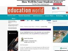 Students complete a six-week unit on North American birds. They conduct research, develop fact sheets, create labeled bird drawings, write a dictionary of bird vocabulary words, create a Concentration game, and observe birds in their...