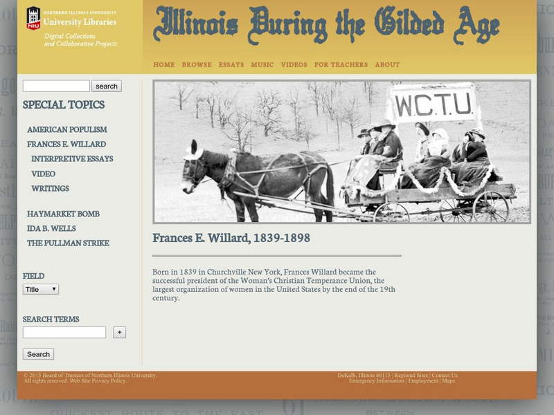 Use this site to read interpretative essays and watch several short videos discussing the many facets of Frances Willlard's life including her work with the temperance movement and women's' suffrage.