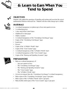 Students examine spending and earning, and calculate change up to a dollar. They view and participate in demonstrations of earning and spending math problems, complete a worksheet, and play a game in pairs that simulates banking.