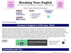 In this Germany and England worksheet, students read the article, answer true and false questions, complete synonym matching, complete phrase matching, complete a gap fill, answer short answer questions, answer discussion questions,...