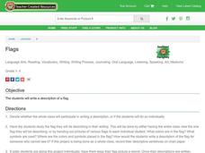 Pupils study the flag they describe in their writing. This is done by either having the entire class view the one flag they are describing, or by handing out pictures of various flags to each individual student.