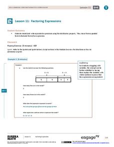 Factor in an informative resource when teaching about factoring. The 11th lesson in a 36-part module shows pupils how to factor algebraic expressions by applying the distributive property. Some of the problems involve expressions with...