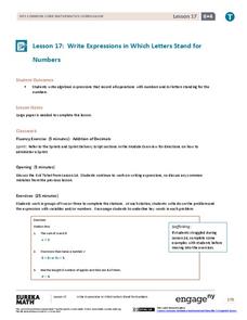 Pencil in the resource on writing verbal phrases into your lesson plans. The 15th installment of a 36-part module has scholars write verbal phases for algebraic expressions. They complete a set of problems to solidify this skill.