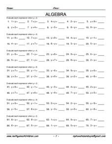 In this evaluating Algebra expressions worksheet, students solve 70 Algebra expressions. Students write each answer on the lines provided on the worksheet.