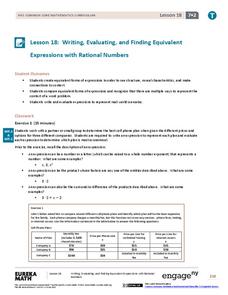 Groups write and evaluate expressions for various phone plans and scenarios to find which is the best deal. They then compare different approaches to writing expressions for the same scenario and discuss the concept of equivalent...
