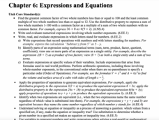 Variables may be unknown, but expressions and equations are easy to understand. Pupils learn to write, evaluate, and simplify numeric and algebraic expressions. They also investigate how to write and solve simple equations and...