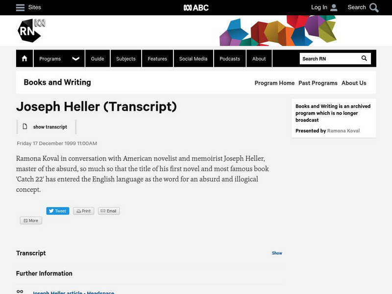 This site from the Australian Broadcasting Company provides the transcript of an interview with author Joseph Heller, who wrote Catch 22. He answers questions about his books Catch 22 and Now and Then and about his view on life. Excerpts...