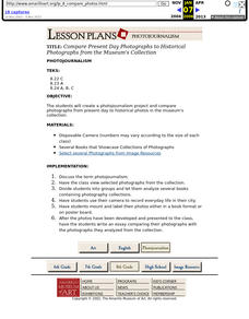 Eighth graders discuss photojournalism and then compare present day to historical photographs. They discuss how photos capture daily life and historical events, compare historic photos to those seen today, then take and make a photo book...