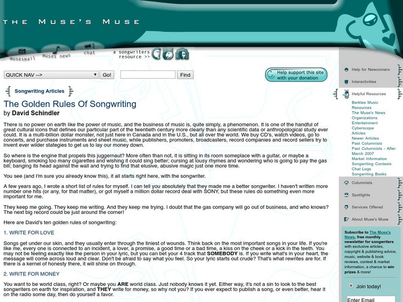 Provides information about composing music and songwriting. Of interest is the Tips & Information section where there are several articles of advice about songwriting.