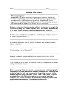 In this paragraph writing worksheet, students review the definition of a paragraph and then read the opening sentences for a paragraph on cooking. Students cut out the sentence strips and arrange the sentences in the order of topic...