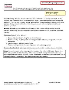 Many regard John Steinbeck's The Grapes of Wrath as the great American novel. The lesson plan combines a variety of strategies, including partner work, independent practice, creative writing, grammar instruction, and small group...