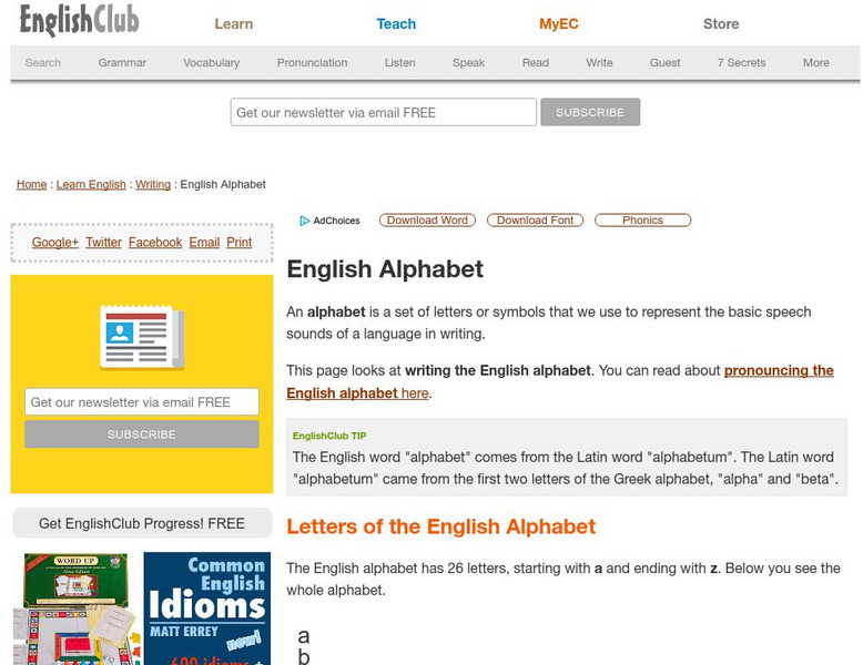 This EnglishClub reference provides information about the English alphabet including examples of upper and lower case letters, alphabetical order, and the following font styles: cursive, serif, sans-serif, fantasy, and fixed-width.