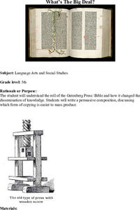 Fifth graders examine the role of the Gutenberg press and its effect on society. Using this information, they write a persuasive paper discussing which form of copying is easier to mass produce. They share their opinions with the class...