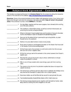 In this subject and verb agreement worksheet, students read the sentences and find the errors in subject and verb agreement. Students draw a line through the errors and write the corrections in the provided space.