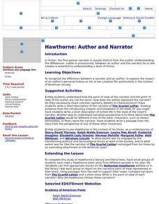 Students read various pieces of literature by Nathaniel Hawthorne to recognize the difference between a narrator and author. Students in small groups report on the narrative point of view represented in a story they have read.