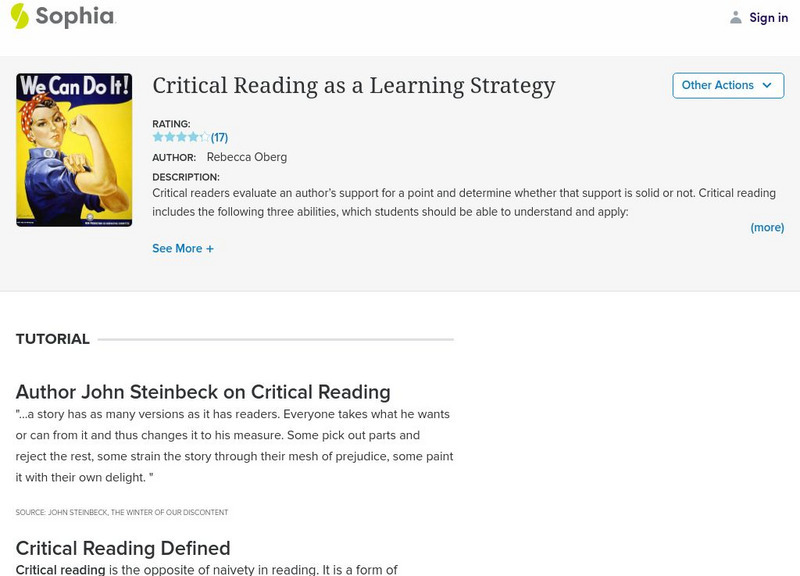 This tutorial focuses on critical reading using a downloadable PowerPoint presentation, "Critical Reading 101," which includes separating fact from opinion, 6 propaganda techniques, and 6 common fallacies in reasoning. Also provided is...