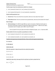 In this graphing lines worksheet, high schoolers graph 28 lines given various data. Students graph lines given two points, a point and slope, and a line perpendicular or parallel to a point.