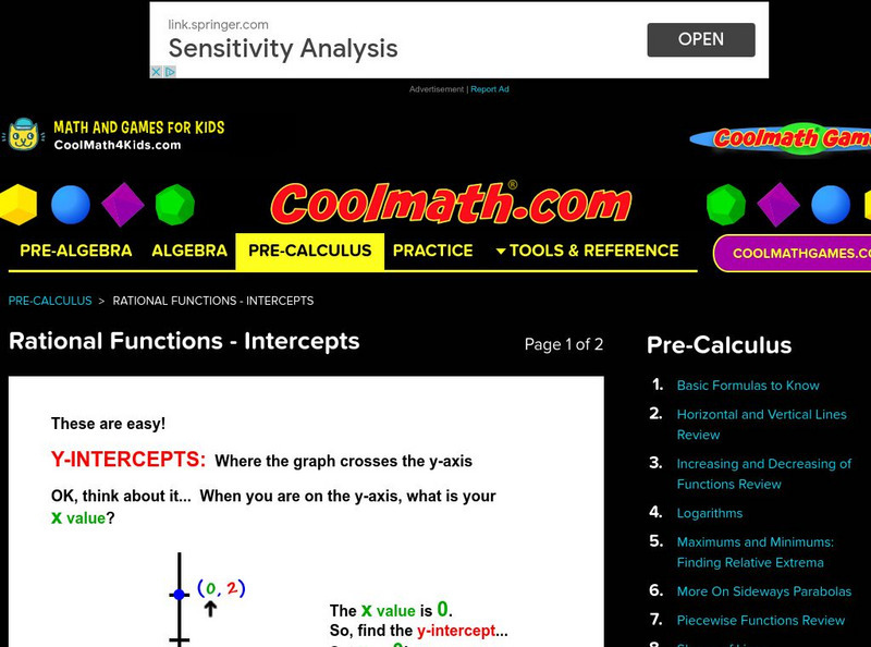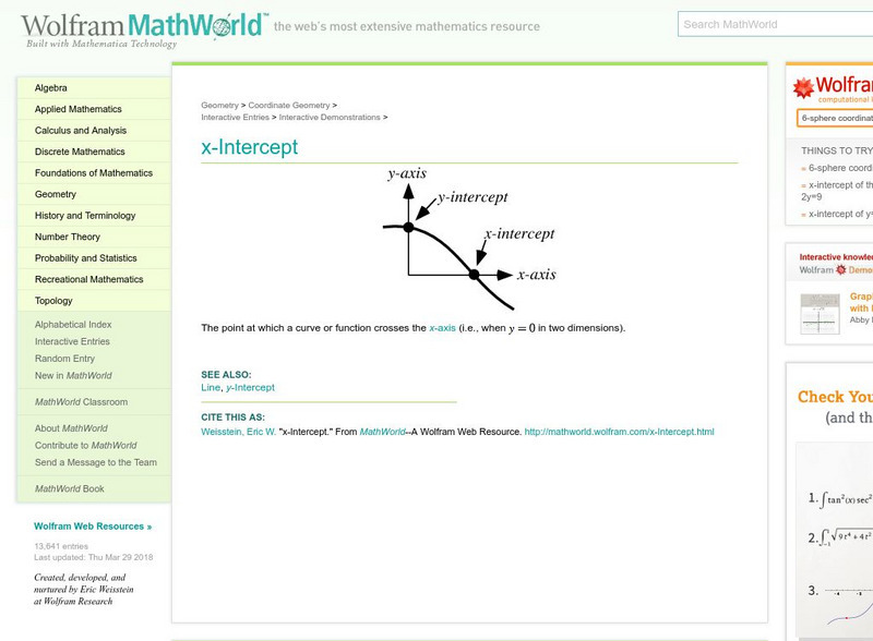Math World explains an x-intercept with a graph and brief definition. The graph shown also points out the y intercept of the given graph.