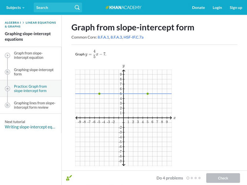 Practice drawing the graph of a line given in slope-intercept form. For example, graph y = 3x + 2. Students receive immediate feedback and have the opportunity to try questions repeatedly, watch a video or receive hints.