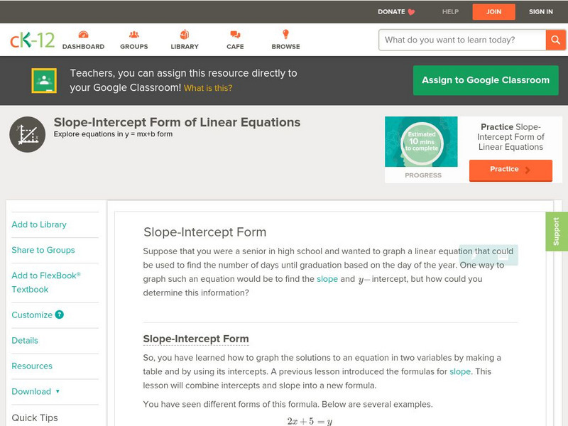 [Free Registration/Login may be required to access all resource tools.] Learn to identify the slope and y-intercept of a linear equation.