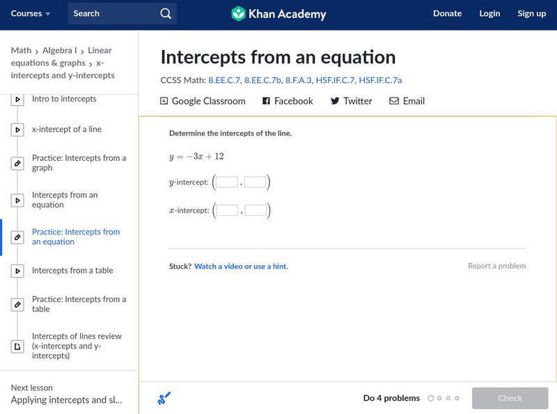 In this exercise, students practice finding intercepts from a linear equation. Students receive immediate feedback and have the opportunity to get hints and try questions repeatedly.