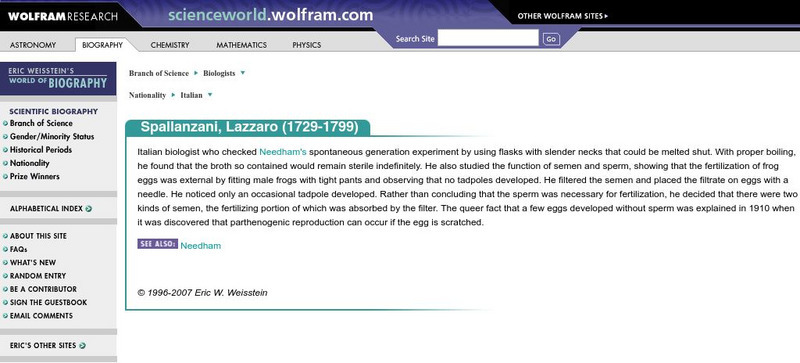 This site from Science World provides very brief but factual information on the life of the Italian biologist, Lazzaro Spallanzani. A link is provided for information on John Needham.