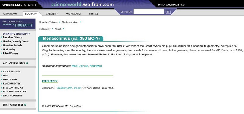 This site from ScienceWorld provides brief but factual biographical information on the Greek mathematician Menaechmus. It contains a quote of his to one of his students when asked for a shortcut to geometry.