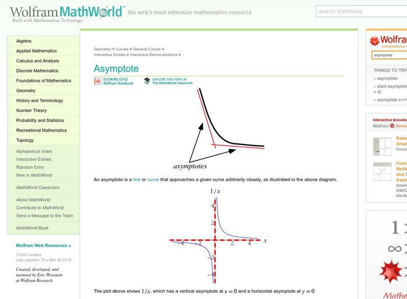 This site from MathWorld provides a picture, or diagram of the asymptotes along with a very brief, one sentence definition. Links are provided for related subjects, along with a short bibliography.