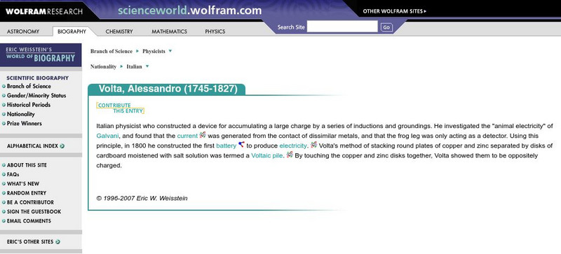 This site from ScienceWorld provides a very short biographical sketch of Alessandro Volta and describes his most notable scientific discoveries and contributions. Several links are also provided for additional information.