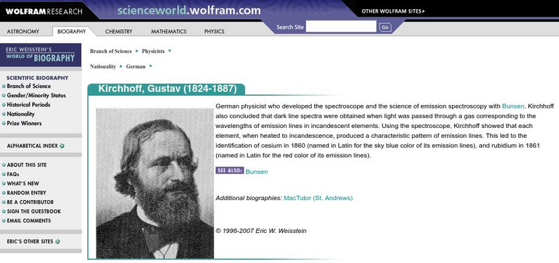This site from ScienceWorld provides a short but factual biographical sketch of the German physicist, Gustav Kirchhoff and describes his most notable discoveries and contributions to the realm of science.