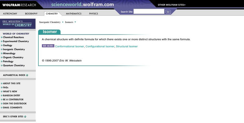 This page from ScienceWorld provides a one sentence long definition of an isomer. Links are provided for additional information, such as: conformational isomer, configurational isomer, and structural isomer.