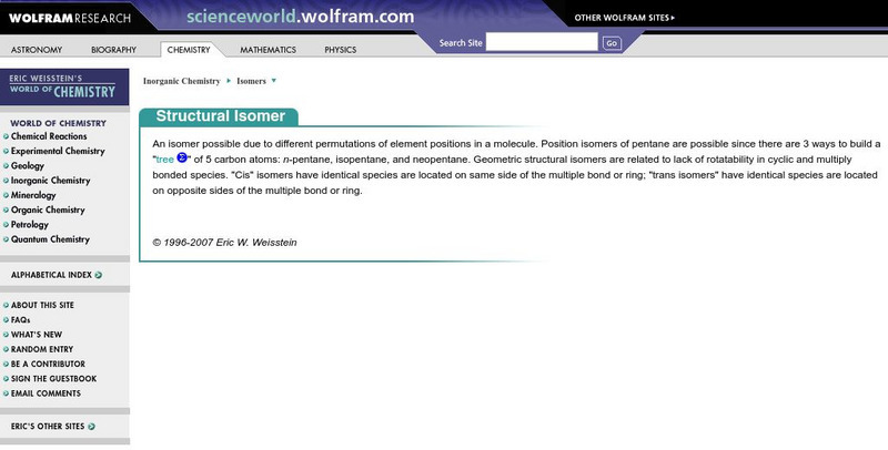 This site from ScienceWorld provides a brief but factual definition on a structural isomer. Includes a link for additional information, and the definition has a scientific style to it.