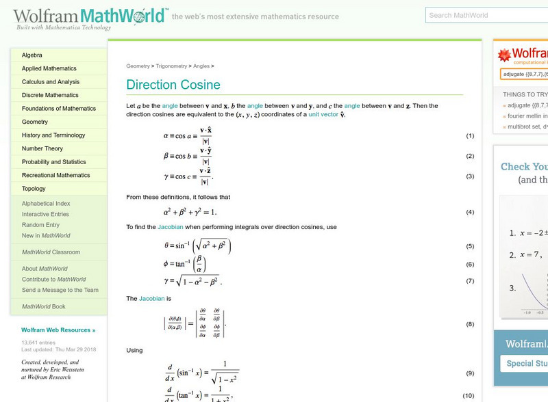 This page discusses the direction cosine, which can be used to find the coordinates of a unit vector in the direction of any given vector. Includes some rather advanced formulas.