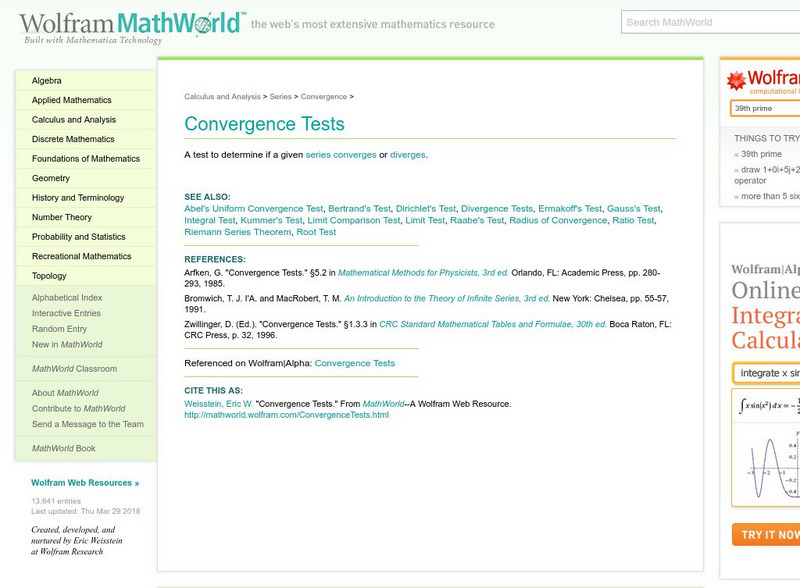 This page provides links to information about tests to determine the convergence or divergence of a series. No information about convergence tests is offered directly at this link.