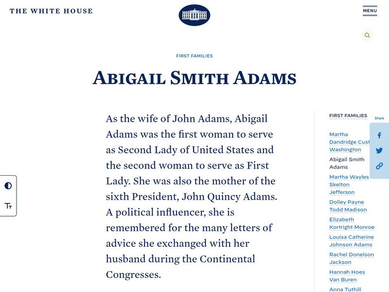 This article on Martha Washington discusses her first marriage and her role as First Lady during the presidency of her second husband, George Washington.