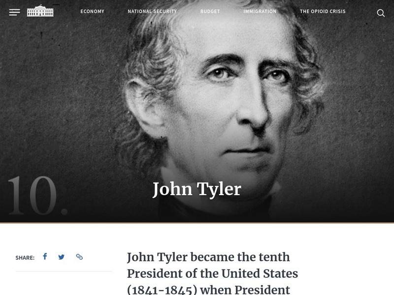 Discusses the presidential term of John Tyler, including the conflicts associated with his political position. A black and white portrait is included.