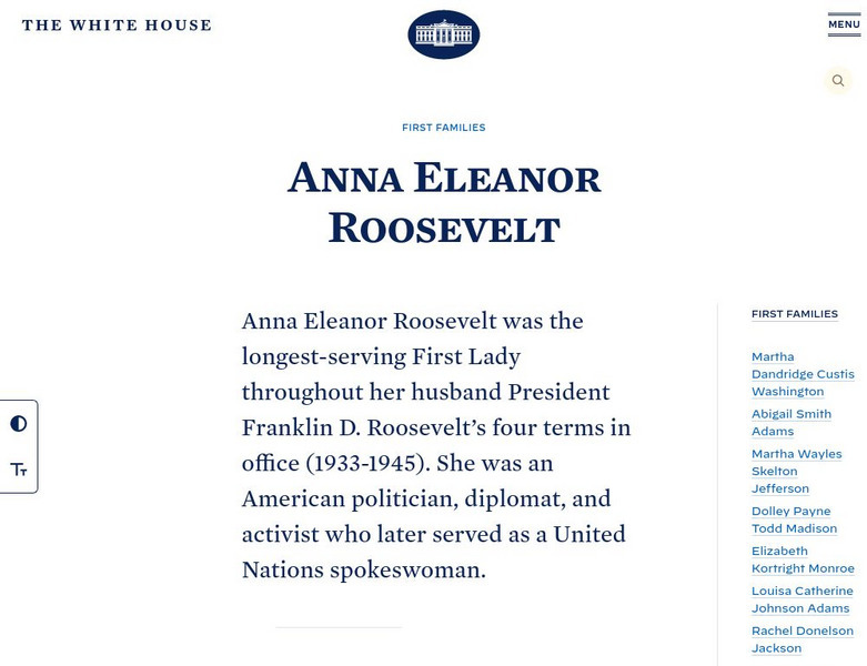 Biographical information on Eleanor Roosevelt, wife of Franklin D. Roosevelt. Her political work and accomplishments are discussed.