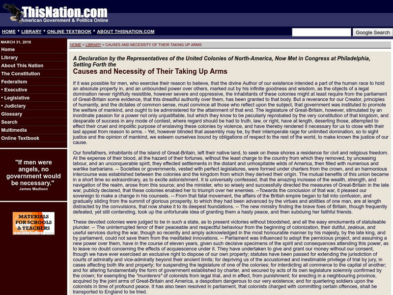 This site provides the declaration by the representatives of the United Colonies of North America in which they set forth the "Causes and Necessity of Their Taking Up Arms."
