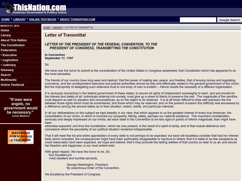 This site provides the letter of the president of the Federal Convention to the president of Congress, transmitting the Constitution.
