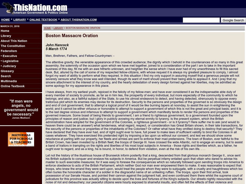 This natiton.com: "Boston Massacre Oration" Hancock