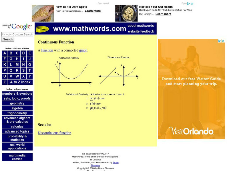 This site defines what a continuous function is. It also gives the conditions that must be present for a function to be continuous at x = a.