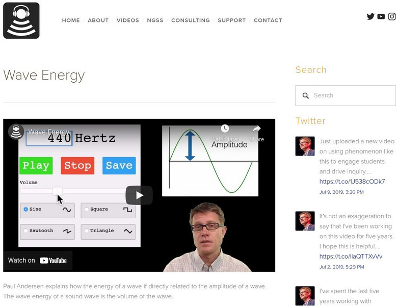 Paul Andersen explains how the energy of a wave if directly related to the amplitude of a wave. The wave energy of a sound wave is the volume of the wave. [3:39]