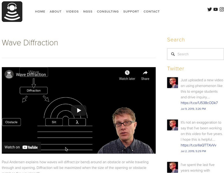 In the following video, Paul Andersen explains how waves will diffract (or bend) around an obstacle or while traveling through an opening. Diffraction will be maximized when the size of the opening or obstacle matches the wavelength. [4:20]
