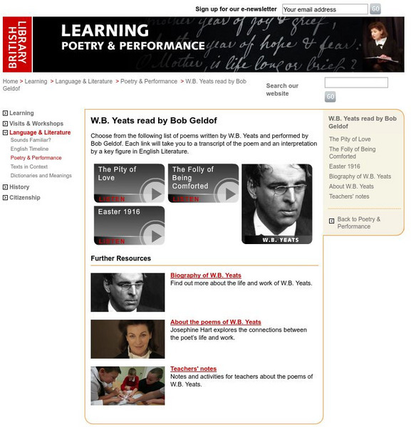 Audio performances of select poems by Irish poet W. B. Yeats, including "Easter 1916," read by Bob Geldof. With a transcript of each poem, a biographical note about the writer's life and career, literary commentary on his work, and...